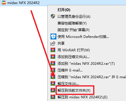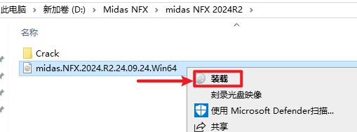 6.返回安装文件夹,选中“midas.NFX.2024.R2.24.09.24.Win64.iso”文件,右键选择“装载”