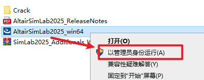 7.返回安装文件夹,选中“AltairSimLab2025_win64”右键选择“以管理员身份运行”