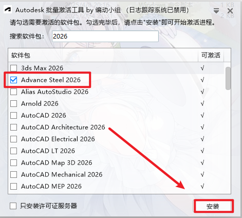 8.勾选“Advance Steel 2026”,点击“安装”