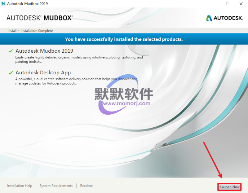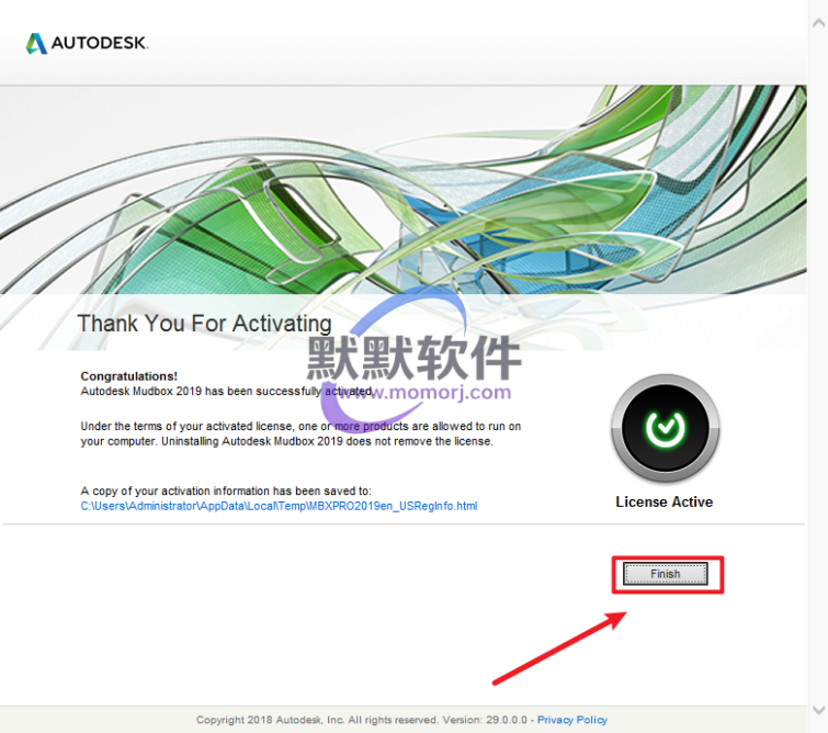 18.出现提示“Autodesk Mudbox 2019 has been successfully activated.”,说明激活成功,点击“Finish”