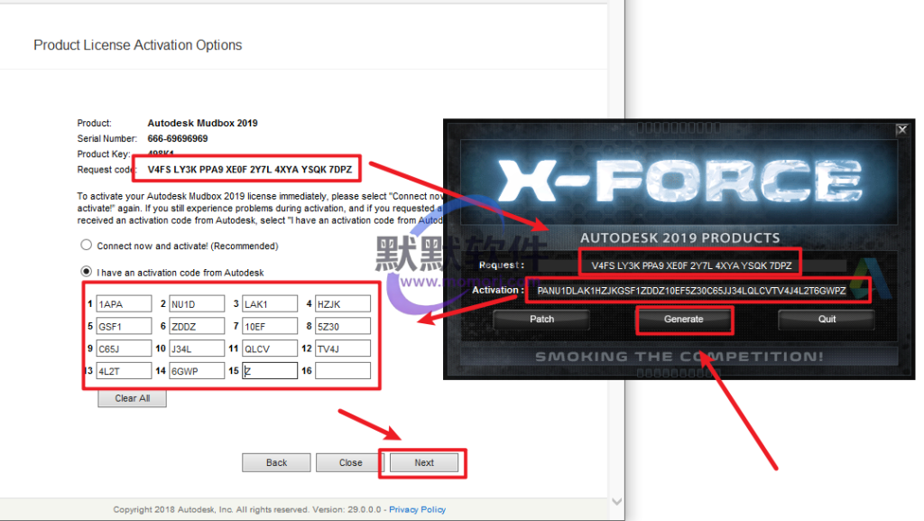 17.将安装界面的“Request code申请码”复制到粘贴到“Request”,点击“Generate”,然后将“Activation”复制粘贴到“I have an activation code from Autodesk我具有Autodesk提供的激活”对应框内,最后点击“Next”