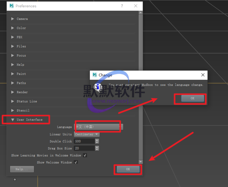 26.依次点击“User interface”–“language–中文”,点击“OK“,点击“OK“