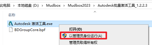 7.返回安装文件夹,双击打开“Autodesk批量激活工具_1.2.2.3”文件夹,选中“Autodesk 激活工具”文件,右键选择“以管理员身份运行”