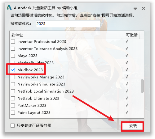 8.勾选“Mudbox 2023”,点击“安装”