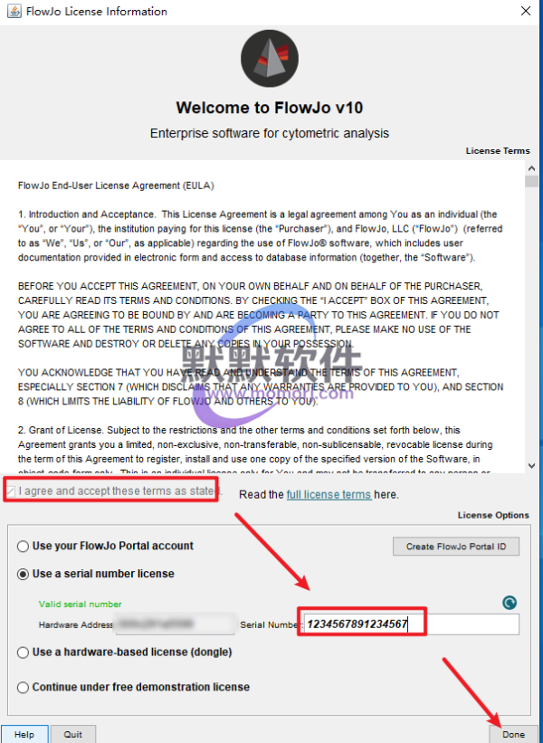 11. 勾选“I agree..”,在序列号一栏填入任意16位字母或数字,如1234567891234567,点击”Done“