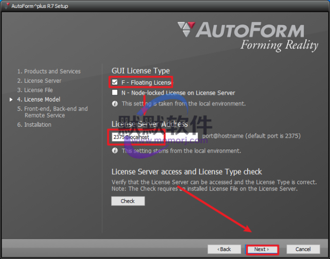 10.勾选“F-Floating License”,License server Address填写:2375@localhost,点击“Next”