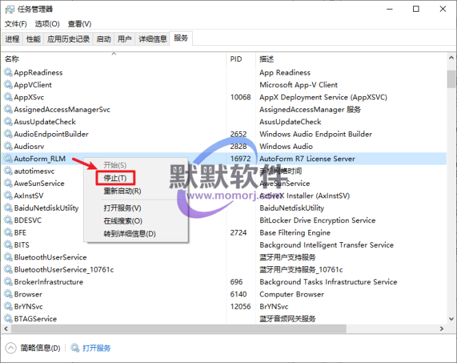 16.打开任务管理器,在服务中找到并选中“AutoForm_RLM”选项右键选择“停止“