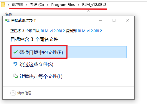 18.依次打开AutoForm RLM安装目录:C:\Program Files\RLM_v12.0BL2,粘贴复制的文件到该路径下,选择“替换目标中的文件夹 ”