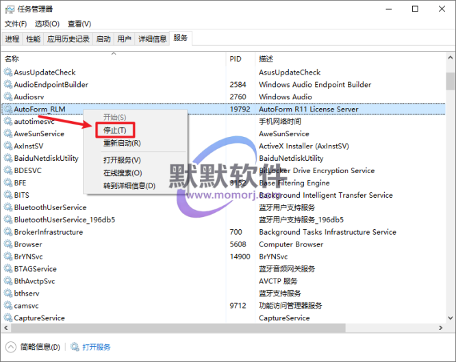 14.打开任务管理器,在服务中找到并选中“AutoForm_RLM”右键选择“停止“