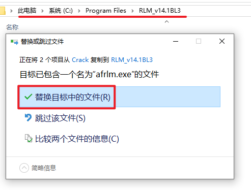 16.依次打开AutoForm RLM安装目录:C:\Program Files\RLM_v14.1BL3,粘贴复制的文件到该路径下,选择“替换目标中的文件夹”