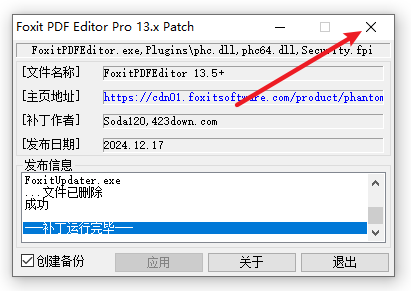 11.提示“补丁运行完毕”,点击右上角的关闭