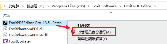 9.粘贴复制的文件到该路径下,选中粘贴过来的“FoxitPDFEditor-Pro-13.x-Patch”文件,右键选择“以管理员身份运行”
