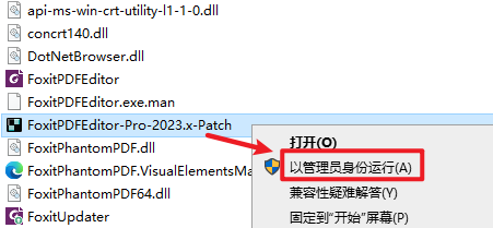 10.找到并选中复制过来的“FoxitPDFEditor-Pro-2023.x-Patch”文件,右键选择“以管理员身份运行”