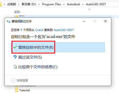 8.返回安装文件夹,双击打开“Crack”文件夹,找到并复制“acad.exe”文件