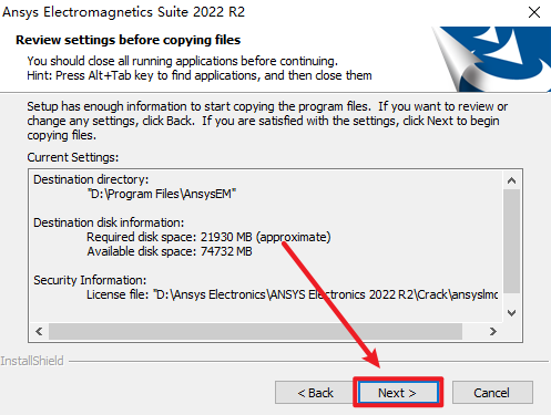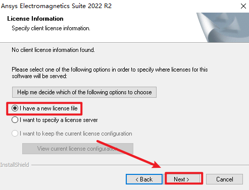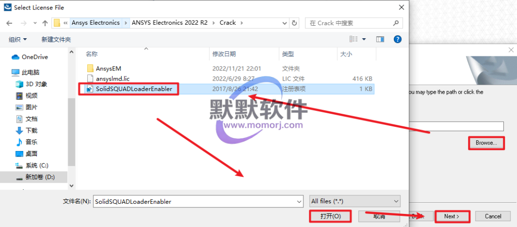 11.点击“Browse…“找到”Ansys Electronics 2022 R2“安装包文件夹,打开“Crack“文件夹,选中“ansyslmd.lic“文件,点击“打开”,点击“Next”