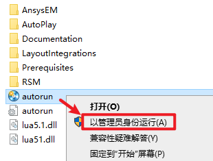 3.在打开的文件夹,选中“autorun.exe”,右键选择“以管理员身份运行”