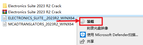 2.打开刚刚解压的文件夹,找到并选中“ELECTRONICS_SUITE__2023R2_WINX64.iso”文件,右键选择“装载”