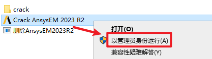 17.返回安装文件夹,双击打开“Electronics Suite 2023 R2 Crack”文件夹,选中“Crack AnsysEM 2023 R2”文件,右键选择“以管理员身份运行”