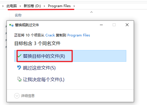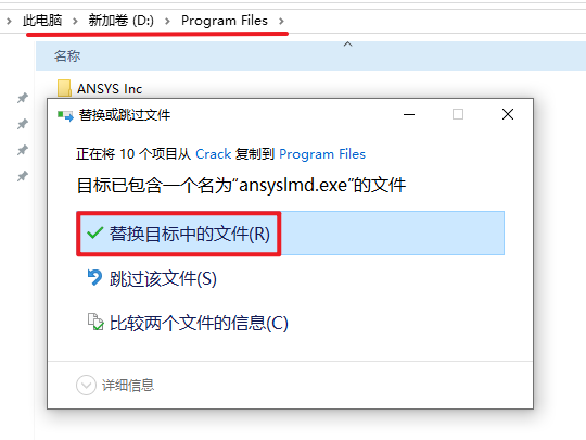12.依次打开ANSYS License Manager安装路径:D:\Program Files,粘贴复制的文件夹到该路径下,选择“替换目标中的文件”