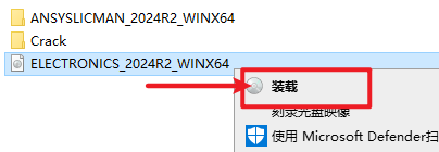 21.返回安装文件夹,选中“ELECTRONICS_2024R2_WINX64”iso文件,右键选择“装载”