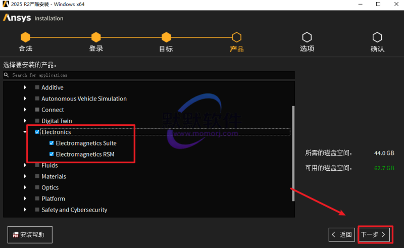 7.此安装包只包含电磁仿真相关的内容,所以只能勾选Electronics下的安装项,点击“下一步”