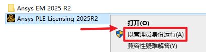 14.返回安装文件夹,选中该文件夹下的“Ansys PLE Licensing 2025R2”文件,右键选择“以管理员身份运行”