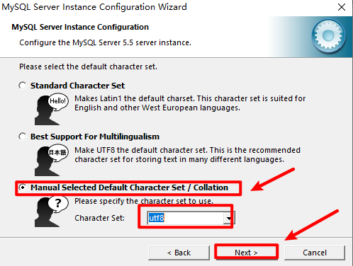 17.选择“Manual Selected Default···“,“Character Set“处选择“utf8“或者“gbk“,点击“Next”